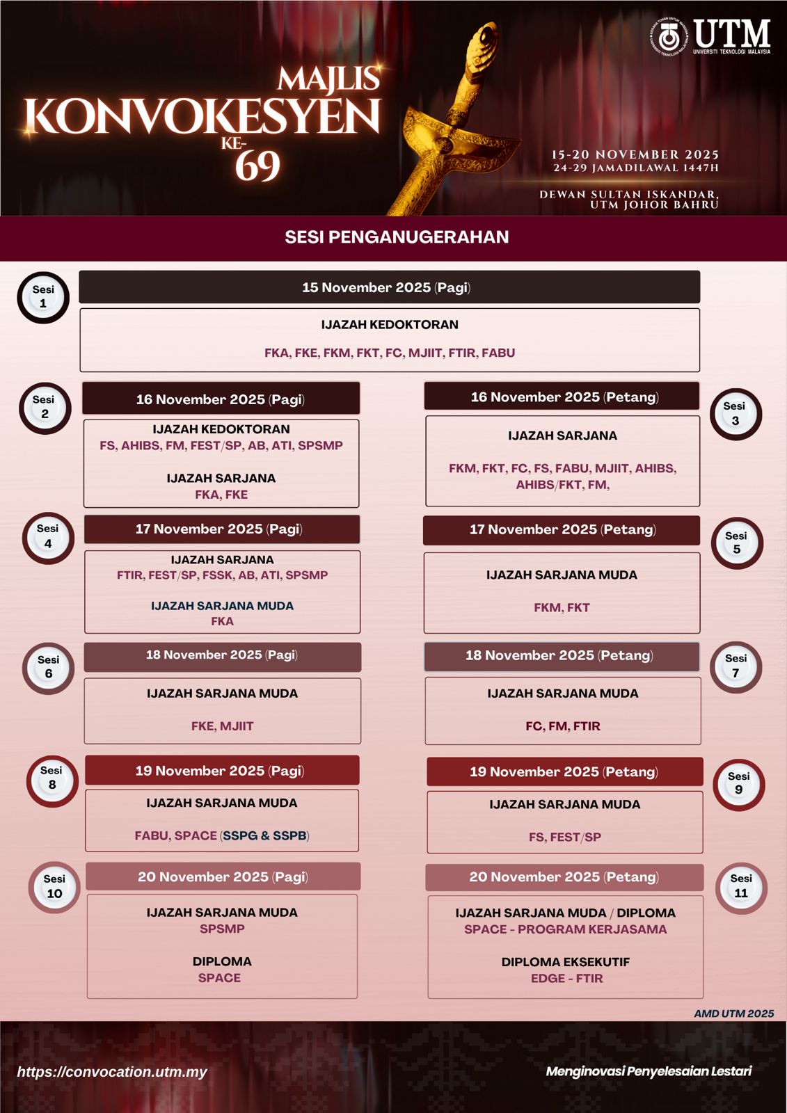 Bagi pelajar berstatus GRADUAN sahaja boleh rujuk info dan maklumat di https://convocation.utm.my/
